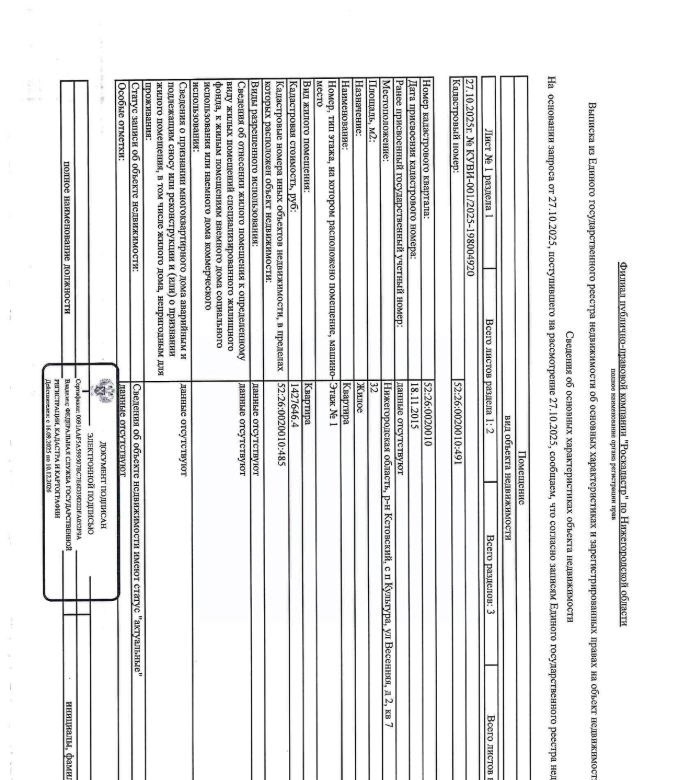 объект размещен на этп sale. zakazrf. ruномер извещения 21000032000000000579форма реализации аукцион. реализация имущества должниковссылка на объект httpssale. zakazrf. runotificationexlotid77980дата начала приема заявок 10. 12. 2025 120000 0300дата окончания приема заявок 29. 12. 2025 235900 0300описание лота от организатораквартира жилое общей площадью 32 кв. м, этаж 1, колво зарегистрированных 2 человека, в т. ч. 1 несовершеннолетний, кадастровый или условный номер 52260020010491. адрес нижегородская обл. , кстовский рн, с. п. культура, ул. весенняя, д. 2, кв. 7